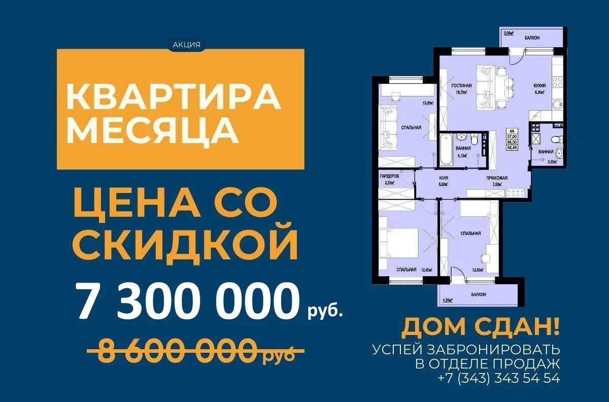 Успевайте купить идеальную квартиру по супер-цене: по специальной цене: 7 300 000 ₽, вместо 8 600 000 ₽.